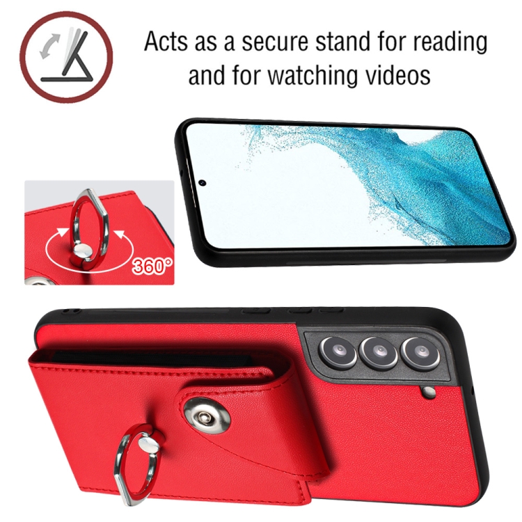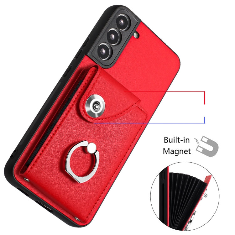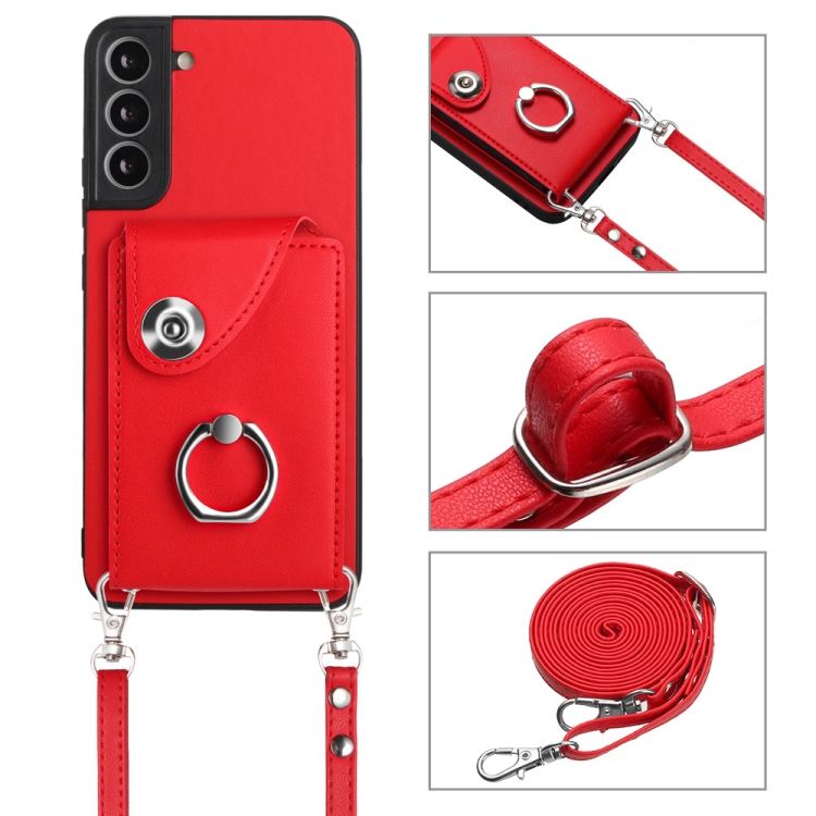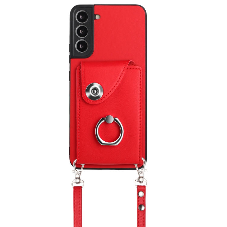 Funda para Teléfono Samsung Galaxy S21 FE 5G con Soporte para Anillo y Bolsa para Tarjeta con Cordón Largo (Rojo)