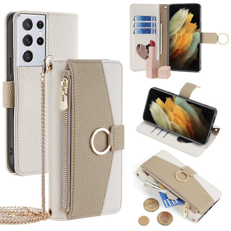 Estuche Cruzado de Cuero para Samsung Galaxy S21 Ultra 5G con Textura Litchi (Blanco)