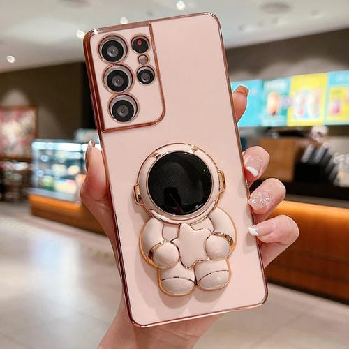 Estuche para Teléfono Samsung Galaxy S24 Ultra 5G Embrace Stars con Soporte para Astronauta Galvanizado (Rosa)