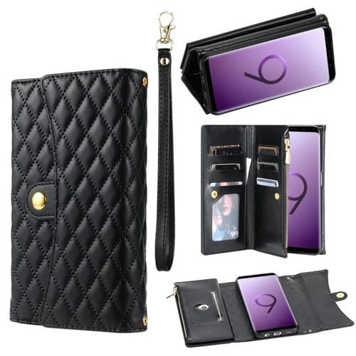 Estuche para Teléfono Samsung Galaxy S9 Cuero Rómbico Billetera MultiTarjeta con Cremallera (Negro)