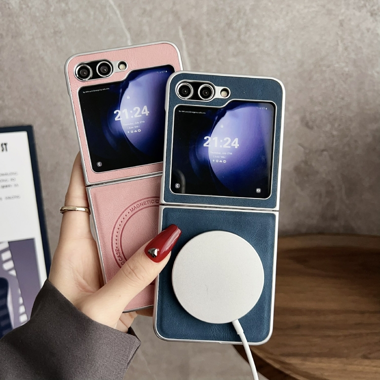 Funda para Teléfono Samsung Galaxy Z Flip5 Skin Feel Textura de Cuero Magsafe Pintura Nacarada a Prueba de Golpes (Azul)