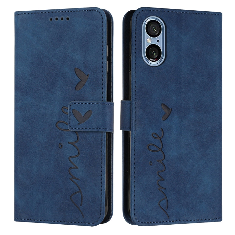 Funda de Cuero Sony Xperia 5 V Skin Feel Heart con Relieve y Cordón Largo (Azul)