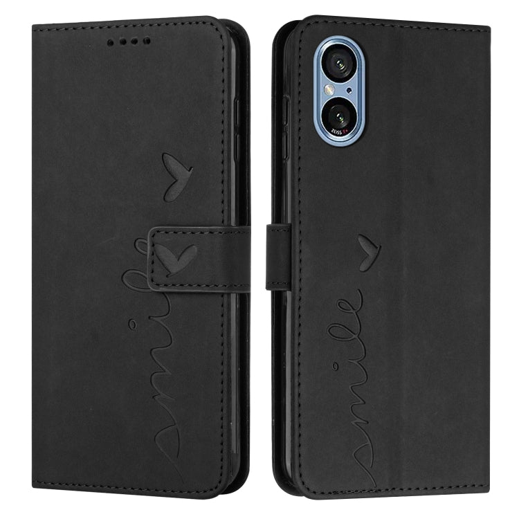 Funda de Cuero Sony Xperia 5 V Skin Feel Heart con Relieve y Cordón Largo (Negro)