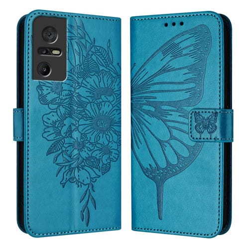 Funda de Cuero para TCL 40 Se con Mariposa en Relieve (Azul)