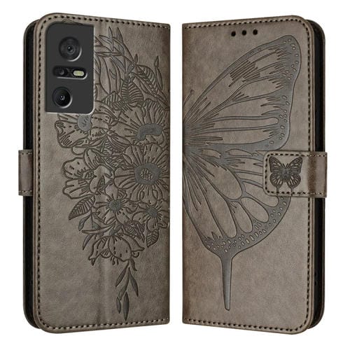 Funda de Cuero para TCL 40 Se con Mariposa en Relieve (Gris)