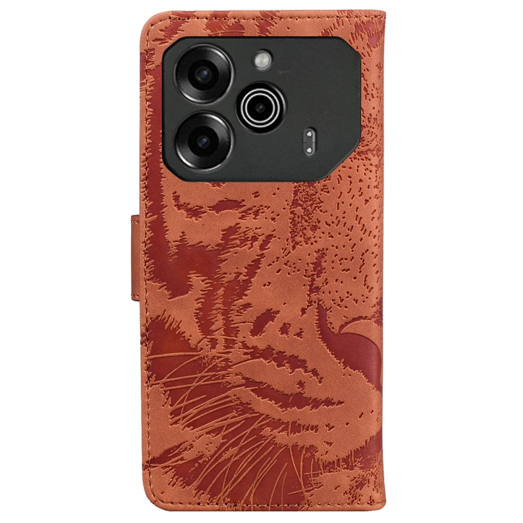 Funda de Cuero para Tecno Pova 6 y Pova 6 Pro con Tapa y Patrón de Tigre (Marrón)