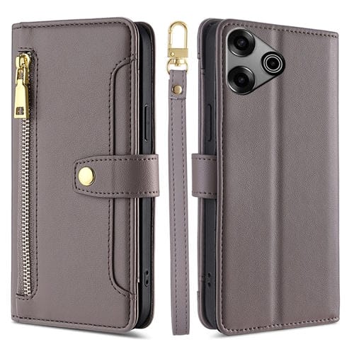 Funda de Cuero para Tecno Pova 6 Pro 5G con Billetera, Cremallera y Textura de Oveja (Gris)