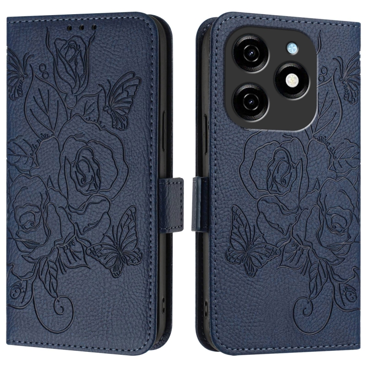 Funda de Teléfono para Tecno Spark 20 Cuero Antirrobo RFID con Rosa En Relieve (Azul Oscuro)