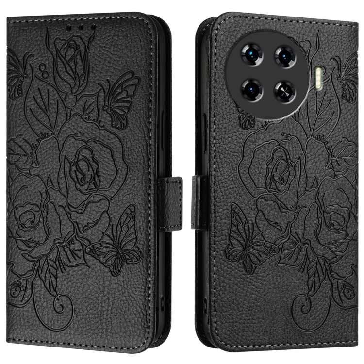 Funda para Tecno Spark 20 Pro de Cuero Antirrobo RFID con Rosa en Relieve (Negro)