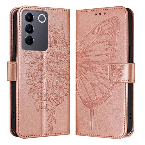 Para Vivo V27E 4G Global / T2 4G Global Funda de Cuero para Teléfono con Mariposa En Relieve (Oro Rosa)