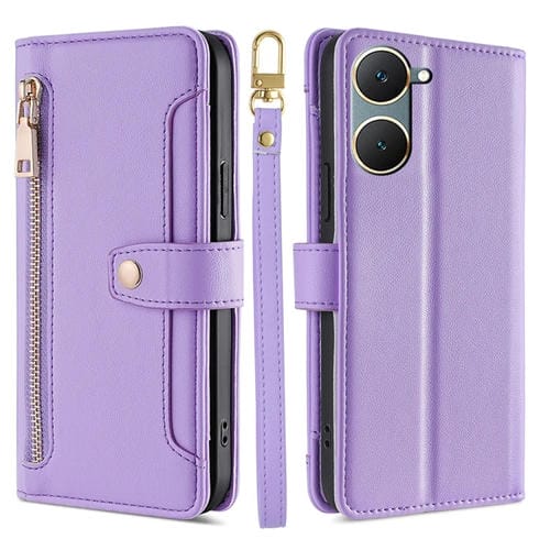 Para Vivo Y03 4G Estuche de Cuero para Teléfono con Billetera con Cremallera y Cuerpo Cruzado con Textura de Oveja (Púrpura)