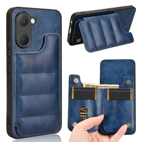 Para Vivo Y03 4G Funda para Teléfono con Bolsa para Tarjetas de Costura con Patrón de Vaca (Azul)