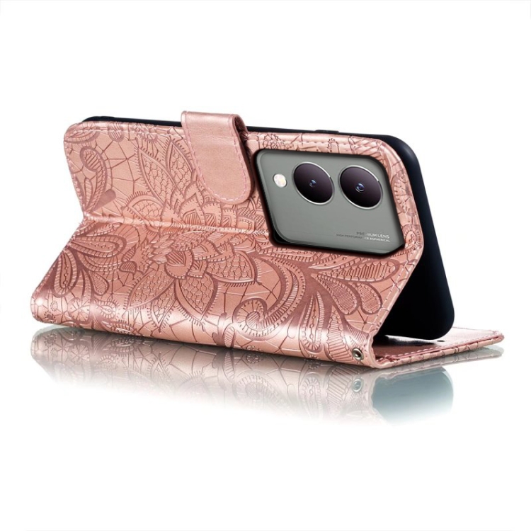 Para Vivo Y17S Funda para Teléfono de Cuero con Tapa y Estampado de Flores de Encaje (Oro Rosa)
