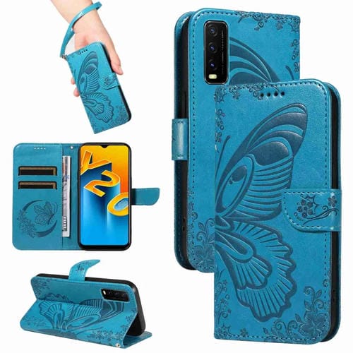 Para Vivo Y20 / Y20S / Y20A / Y20I / Y20G Funda para Teléfono de Cuero con Relieve de Mariposa de Cola de Golondrina (Azul)