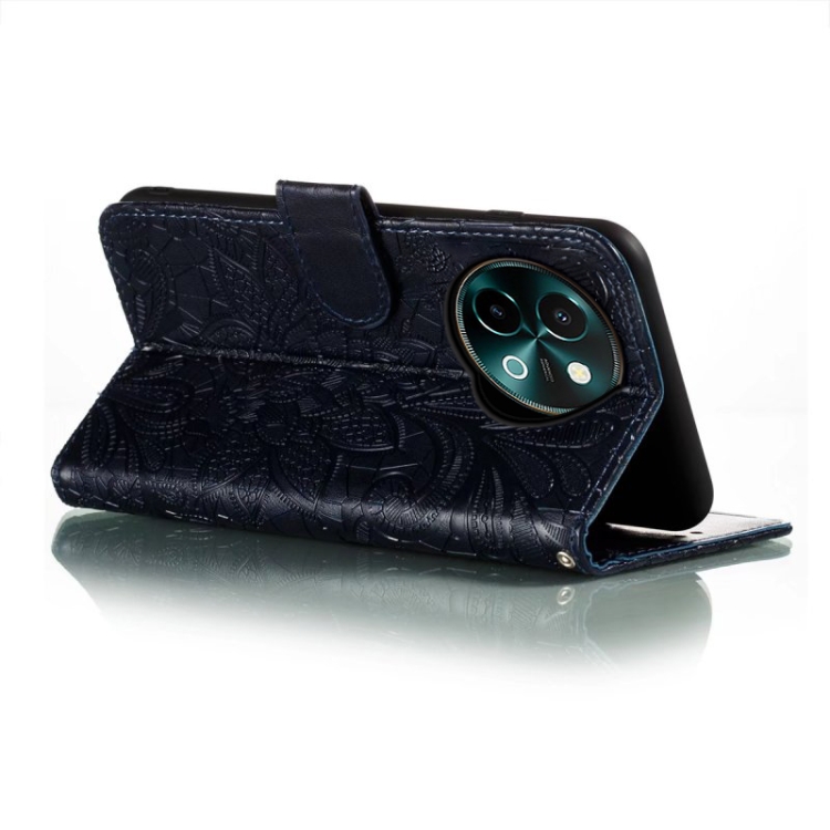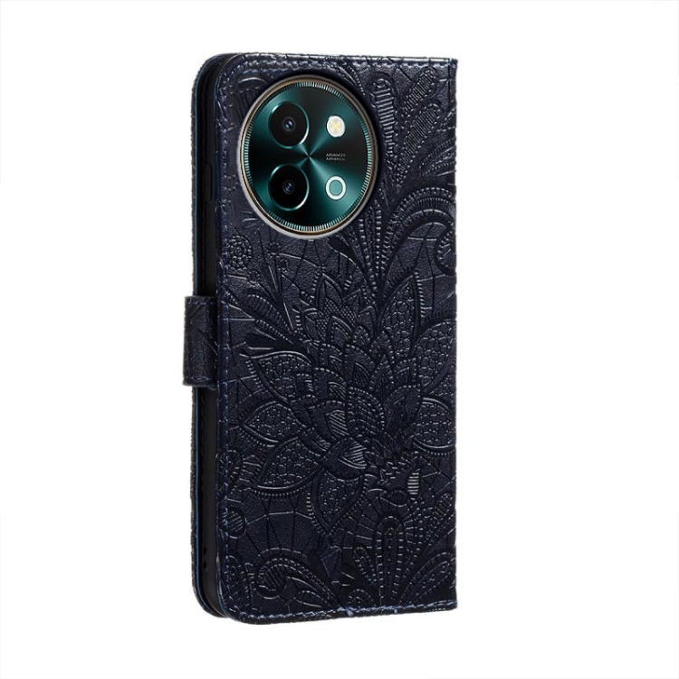 Para Vivo Y38 Funda para Teléfono de Cuero con Tapa y Estampado de Flores de Encaje (Azul Oscuro)
