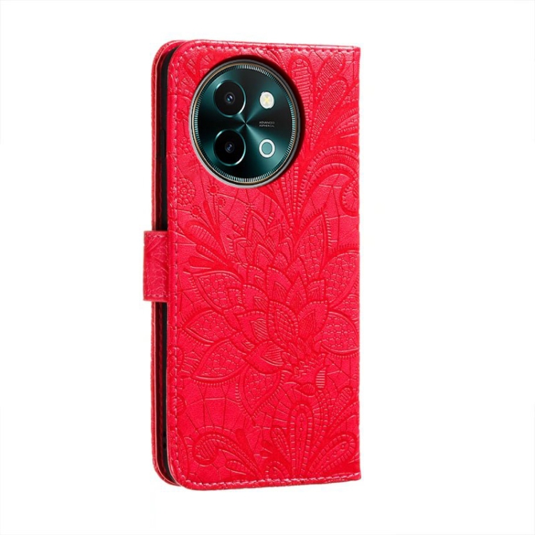 Para Vivo Y38 Funda para Teléfono de Cuero con Tapa y Estampado de Flores de Encaje (Rojo)