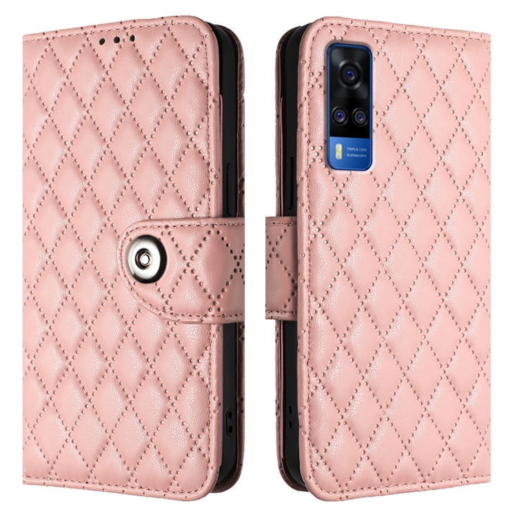 Para Vivo Y53S 5G / Y51A / Y33 Funda para Teléfono con Tapa de Cuero con Textura Rómbica y Cordón (Rosa Coral)