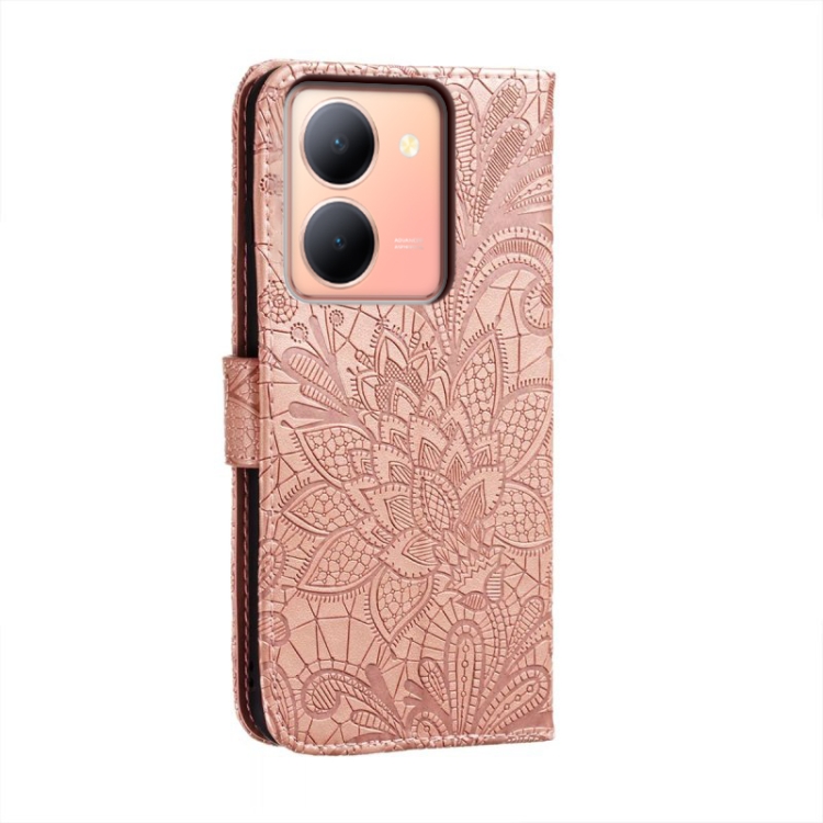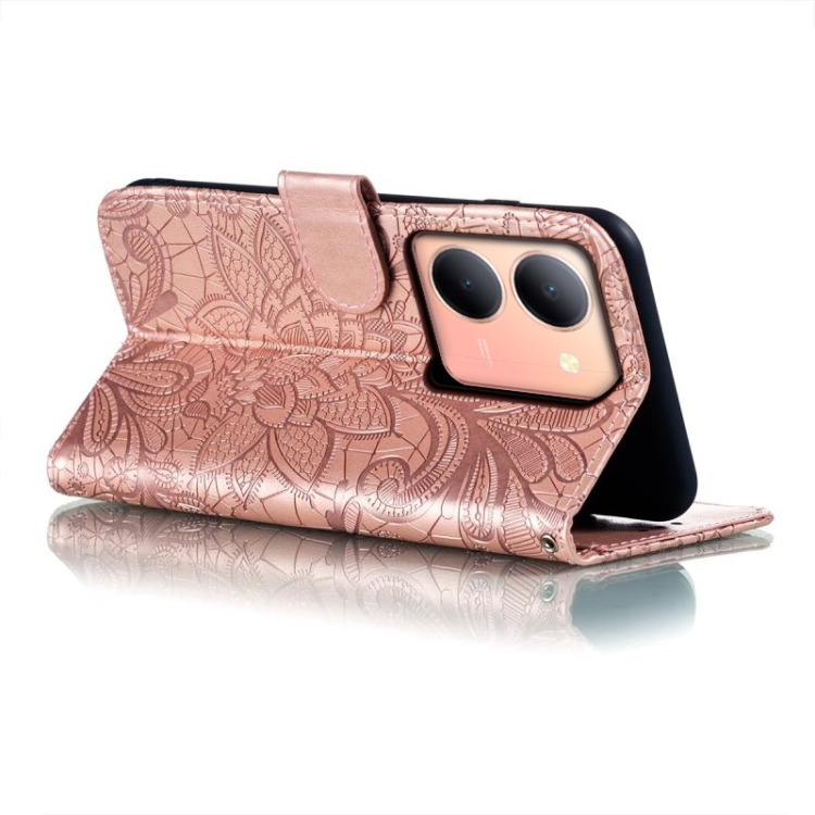 Para Vivo Y78 Funda para Teléfono de Cuero con Tapa y Estampado de Flores de Encaje (Oro Rosa)