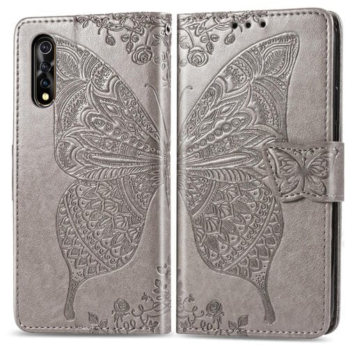 Para Vivo Y7S / S1 Butterfly Love Flowers Estuche de Cuero con Tapa Horizontal En Relieve con Soporte, Ranuras para Tarjetas, Billetera y Cordón (Gris)