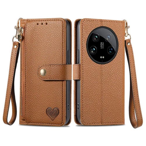 Para Xiaomi 14 Ultra Love Zipper Lanyard Funda De Cuero Para Teléfono (Marrón)