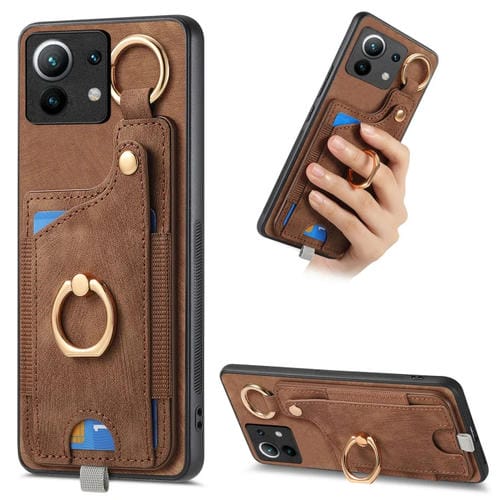 Para Xiaomi Mi 11 Funda para Teléfono con Bolsa para Tarjeta con Anillo y Sensación de Piel Retro con Lazo para Colgar (Marrón)
