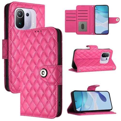 Para Xiaomi Mi 11 Pro Funda de Cuero con Tapa con Textura Rómbica y Cordón (Rojo Rosa)