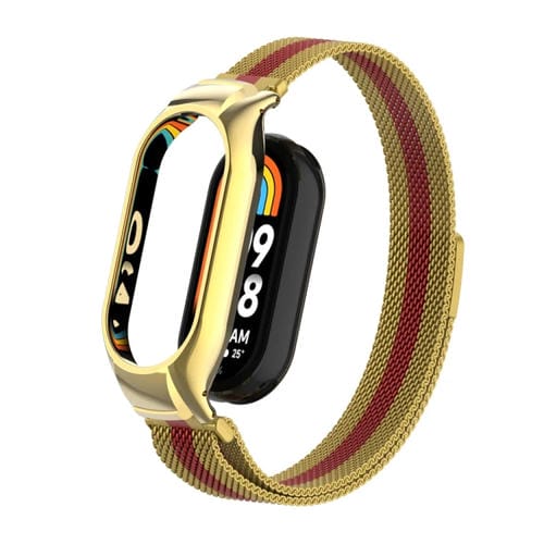 Caja de Metal para Xiaomi Mi Band 8 + Banda Magnética Milanesa (Oro + Rojo)