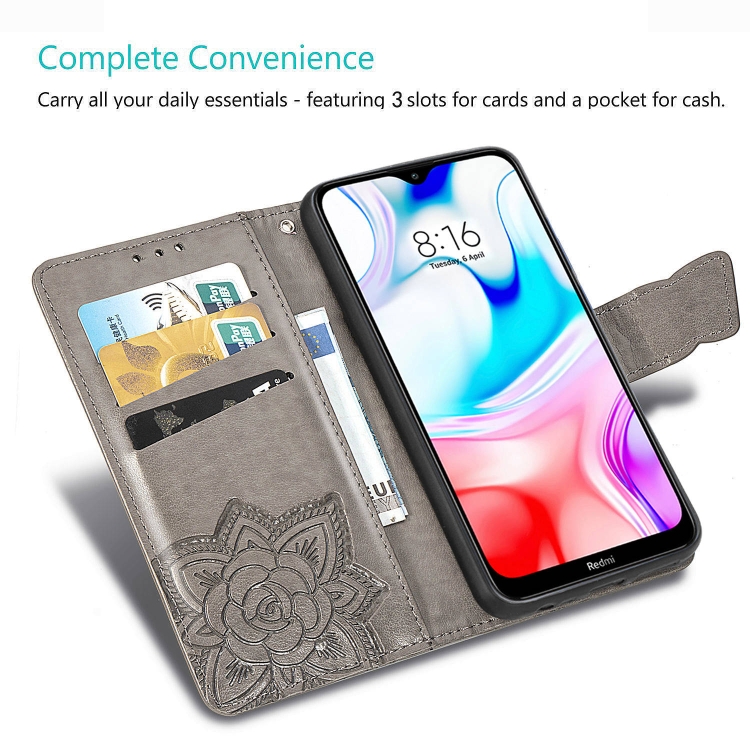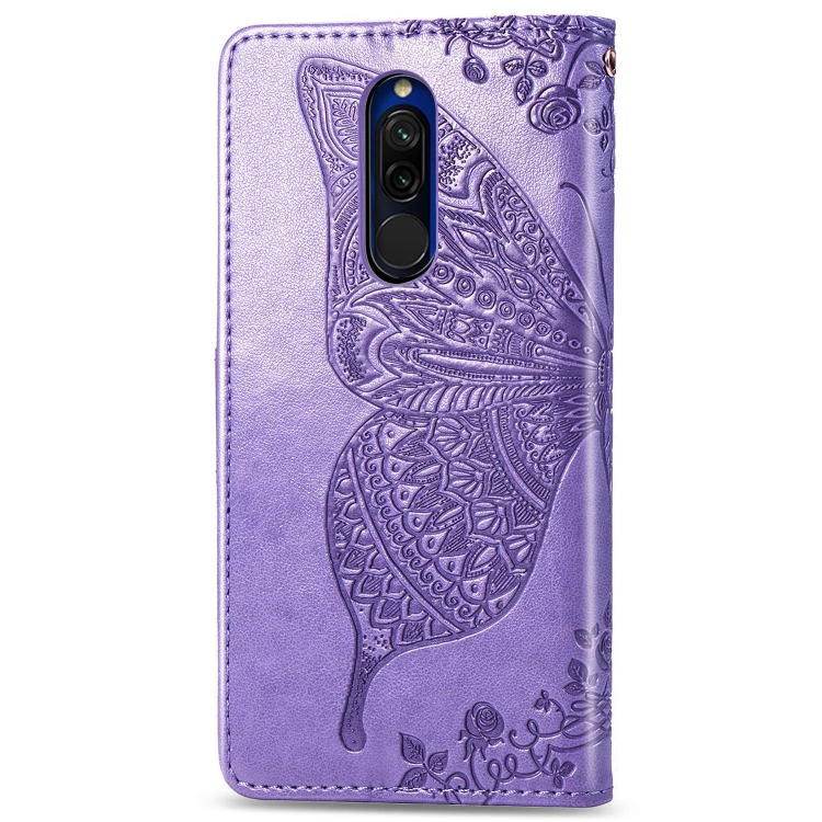 Para Xiaomi Redmi 8 Butterfly Love Flower Funda de Cuero con Tapa Horizontal En Relieve con Soporte Ranura para Tarjeta con Cordón Monedero