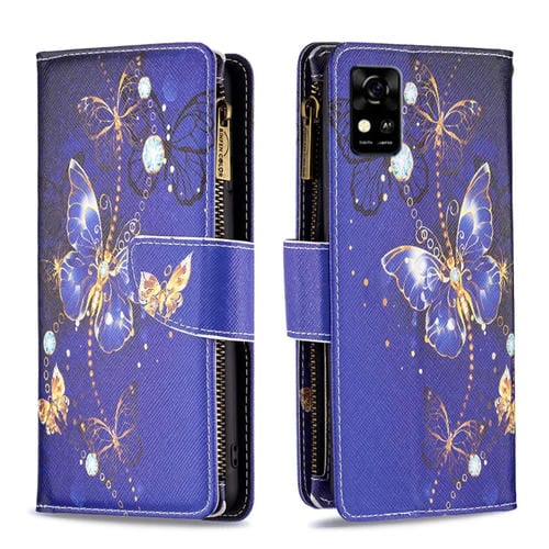 Funda de Cuero para ZTE Blade A31 con Patrón de Dibujo y Cremallera Horizontal (Mariposa Púrpura)