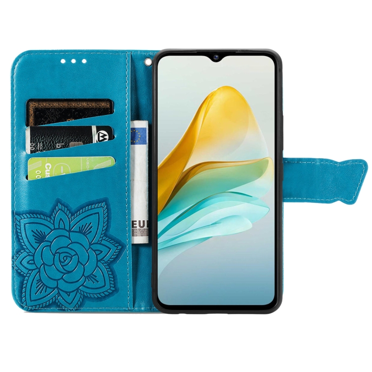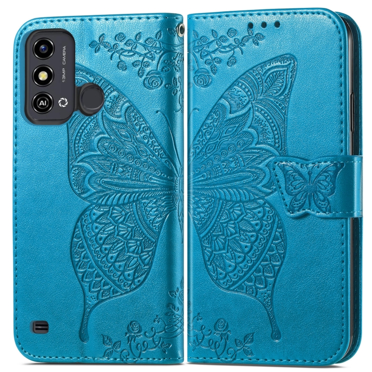 Funda para ZTE Blade A53 Butterfly Love Flower Cuero En Relieve (Azul)
