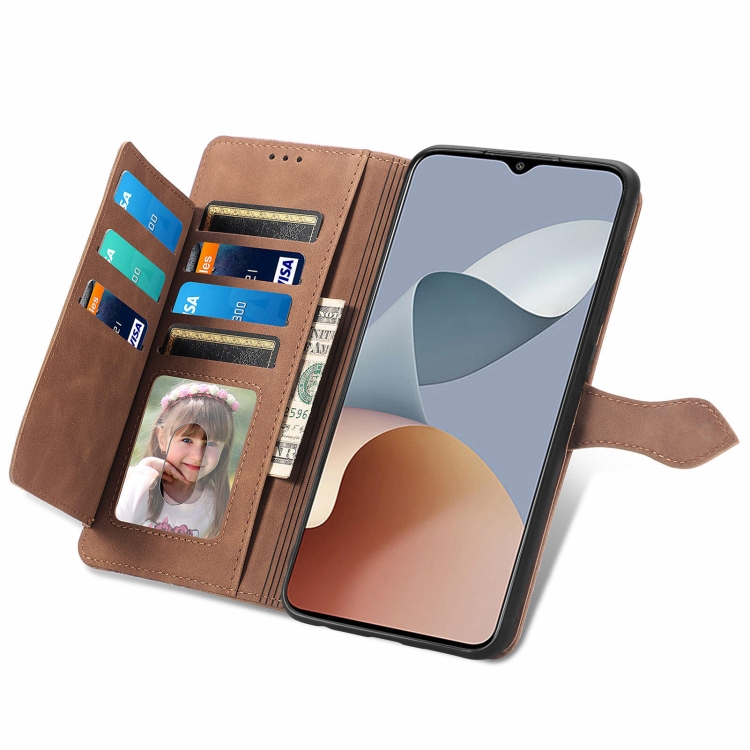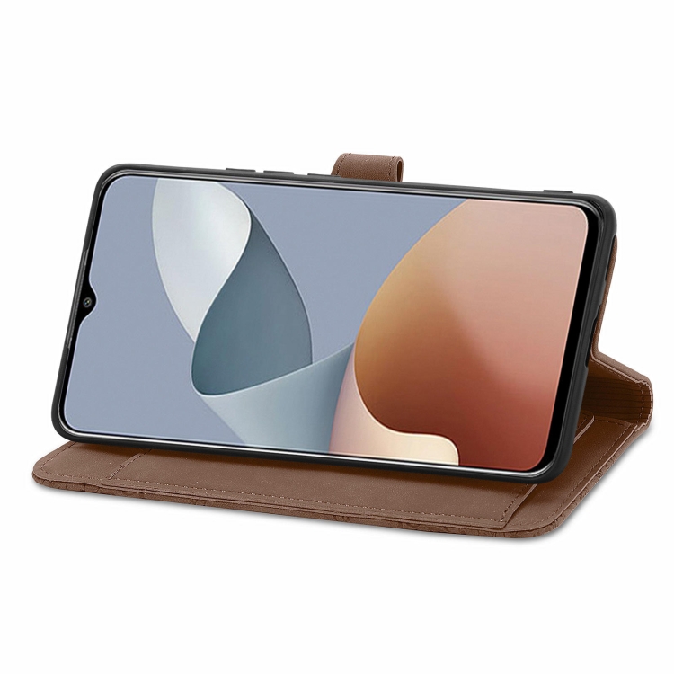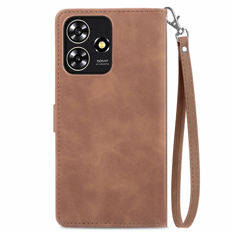 Funda de Cuero para ZTE Blade A73 4G con Cremallera y Flores en Relieve (Marrón)