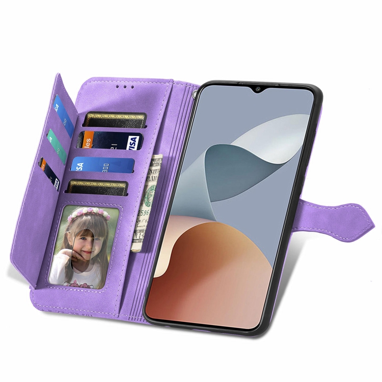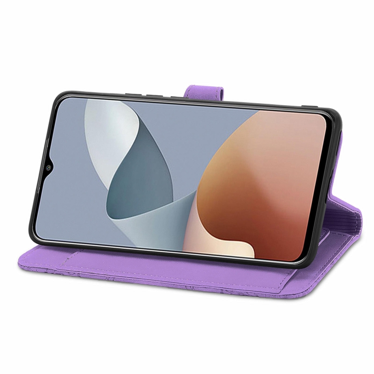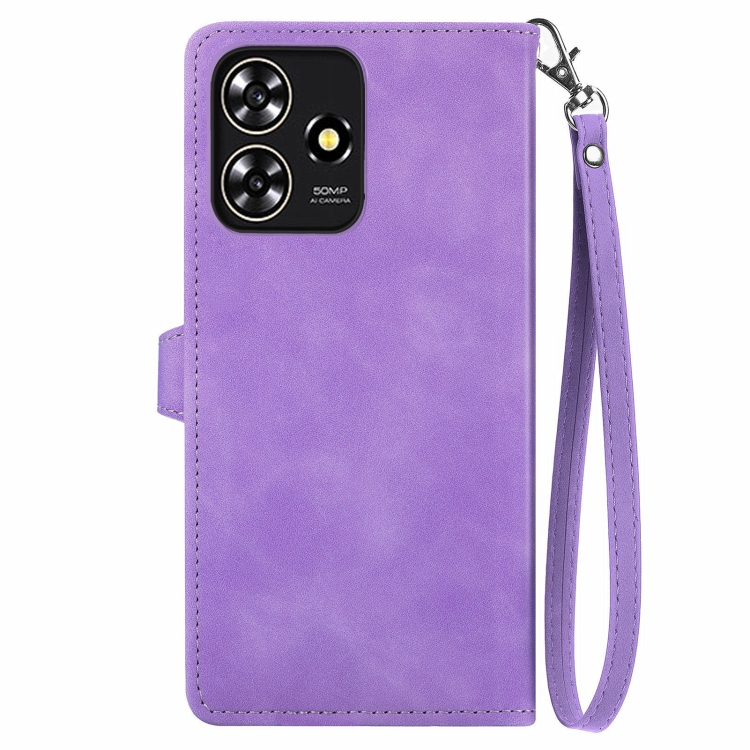 Funda de Cuero para ZTE Blade A73 4G con Cremallera y Flores en Relieve (Púrpura)