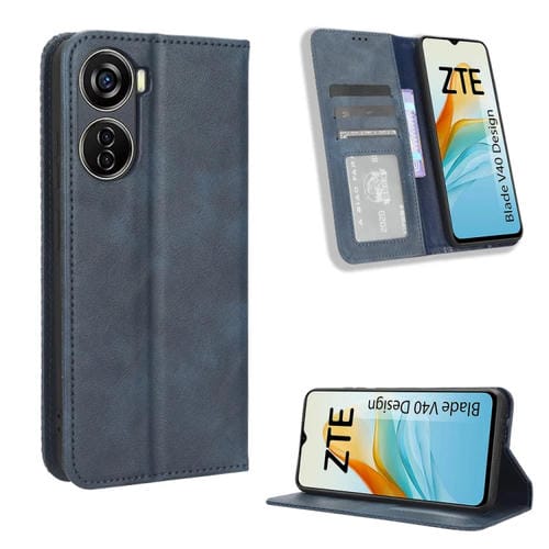 Funda de Cuero para ZTE Blade V40 con Hebilla Magnética y Textura Retro (Azul)