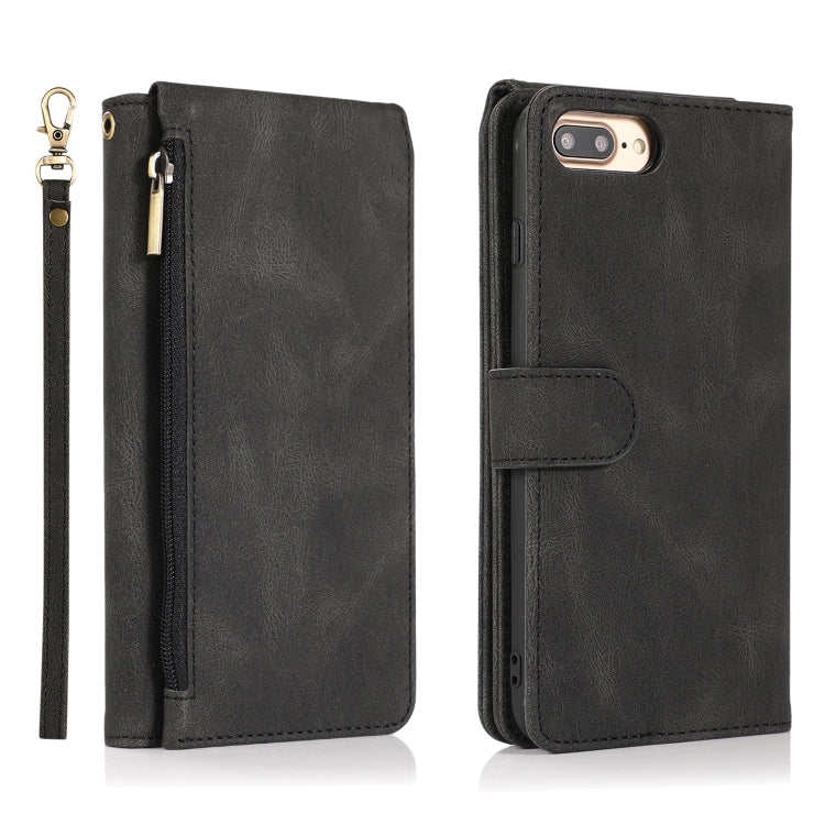 Funda de Cuero Skin-Feel Crazy Horse Texture Zipper Wallet Bag para iPhone 8 Plus / 7 Plus con Tapa Horizontal, Soporte, Ranuras y Cordón (Negro)