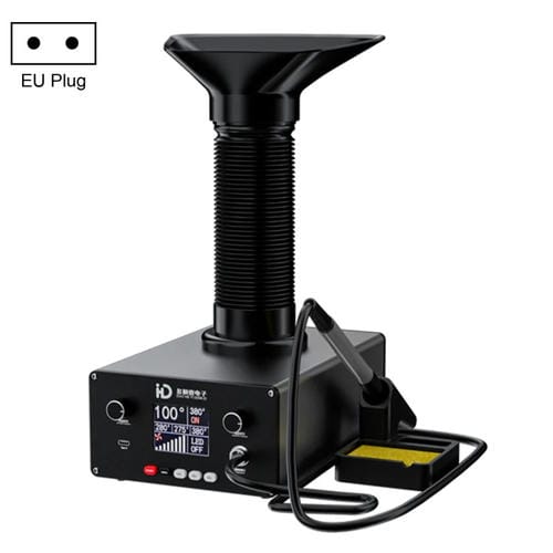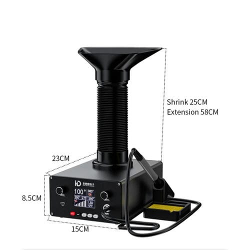 • Potencia total de 150W, potencia del cabezal de soldador 72W, longitud de línea del mango 1,2 m, pipa de absorción de humo de 56 cm con ajuste de 360 grados, iluminación LED de tres orificios para mejor visibilidad