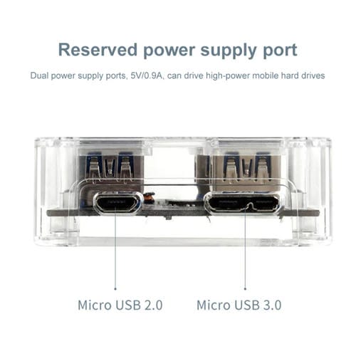• Velocidad de transmisión de hasta 5 Gbps; Voltaje de Carga: 5V/0.9A; Tamaño: 57x57x20mm; Puerto de fuente de Alimentación reservado para Soporte de Discos duros Móviles