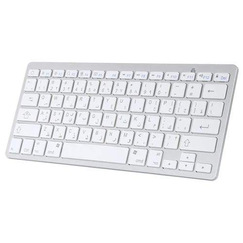- Bluetooth versión 3.0, 78 teclas incluyendo siete teclas multimedia y teclas árabes, distancia de funcionamiento de 10 metros, dimensiones de 28,5 x 12,0 x 1,8 cm, peso de 278 gramos, alimentado por 2 pilas AAA (no incluidas), interruptor de Encendido para ahorro energético
