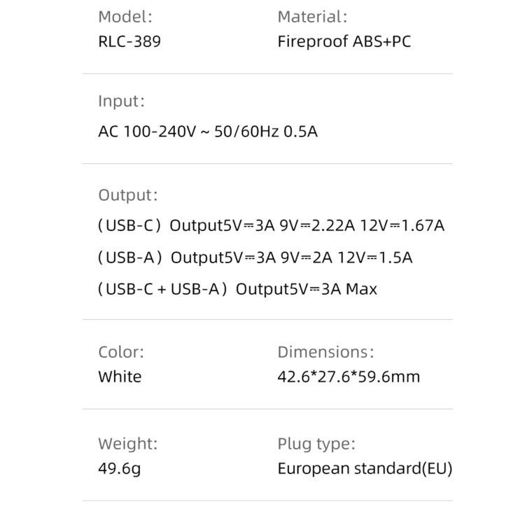 - Entrada: CA 100-240V~50/60Hz 0.5A; Salida USB-C: 5V/3A, 9V/2,22A, 12V/1,67A; Salida USB-A: 5V/3A, 9V/2A, 12V/1,5A; Salida combinada USB-C + USB-A: 5V/3A máx.; dimensiones 4,3 x 2,8 x 6 cm