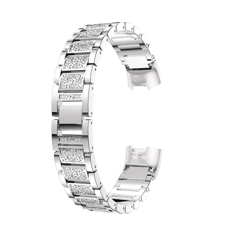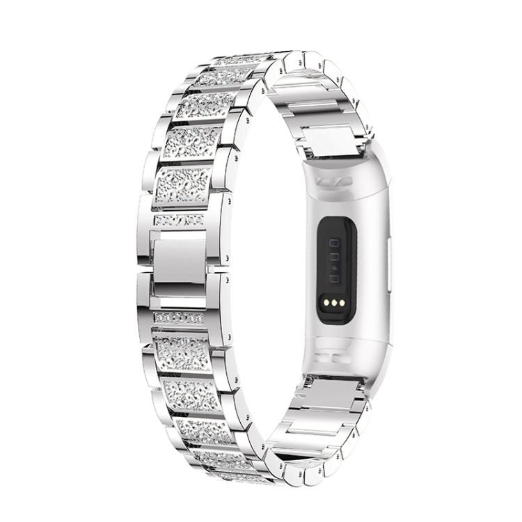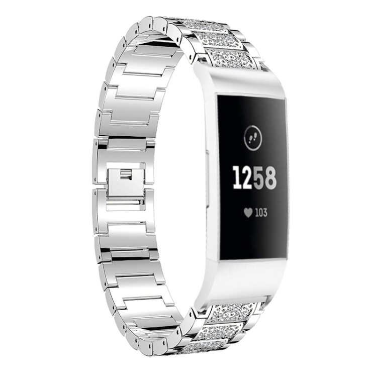 Banda de reloj de acero inoxidable sólido con tachuelas de diamante para Fitbit Charge 3 (plata)