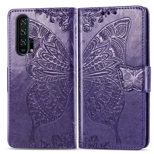 Funda de Cuero Butterfly Love Flowers para Huawei Honor 20 Pro con Soporte, Ranuras, Billetera y Cordón (Morado Oscuro)