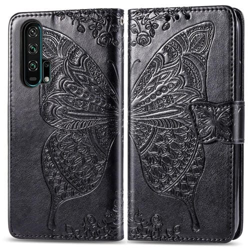 Funda de Cuero Butterfly Love Flowers con Tapa Horizontal para Huawei Honor 20 Pro con Soporte y Billetera (Negro)