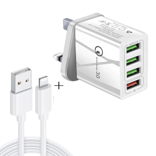 Título optimizado: Cable de Datos 2 en 1 USB a 8 Pines + 30W QC 3.0 4 Interfaces USB Cargador Rápido Universal (Blanco)