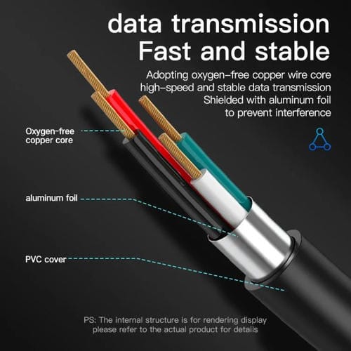 - Transmisión de datos estable y protegida contra interferencias gracias al núcleo de cobre libre de oxígeno y la lámina de aluminio