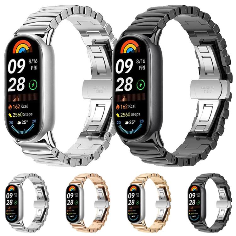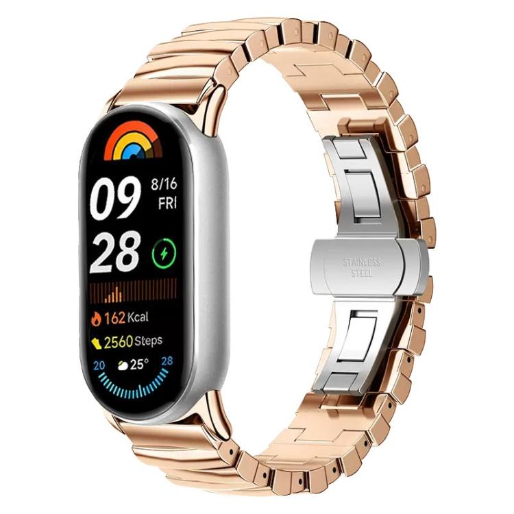 Correa de acero inoxidable con hebilla de mariposa irregular para Xiaomi Smart Band 9/8 (oro rosa)