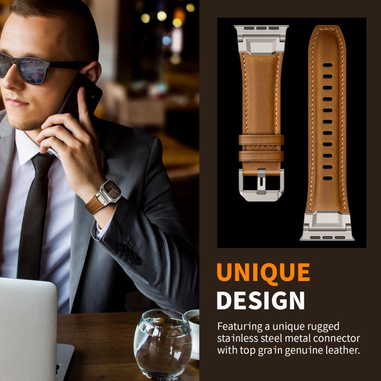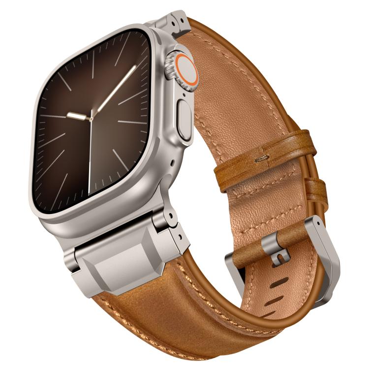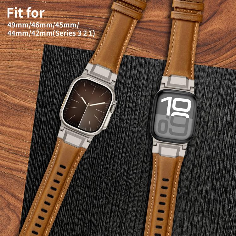 Correa de cuero estilo armadura para Apple Watch de 46 mm, 49 mm, 45 mm y 44 mm (hebilla de titanio de cuero Crazy Horse marrón rojizo oscuro)