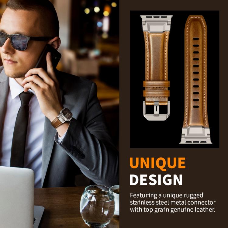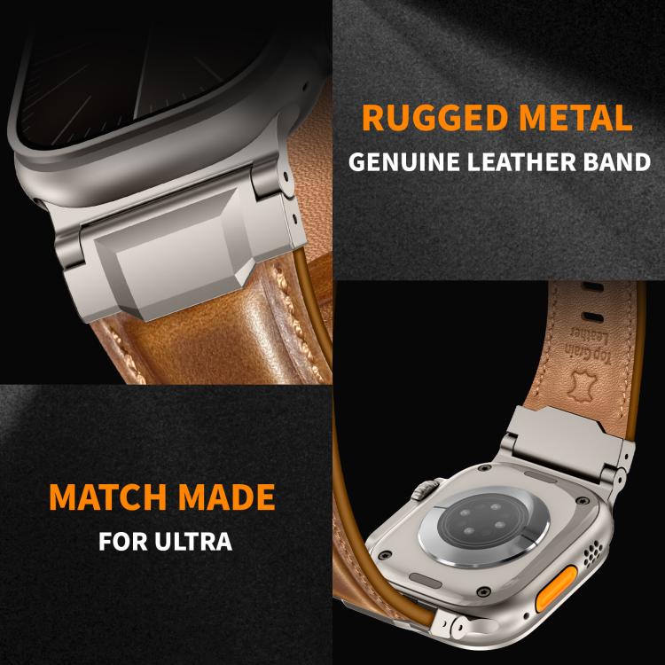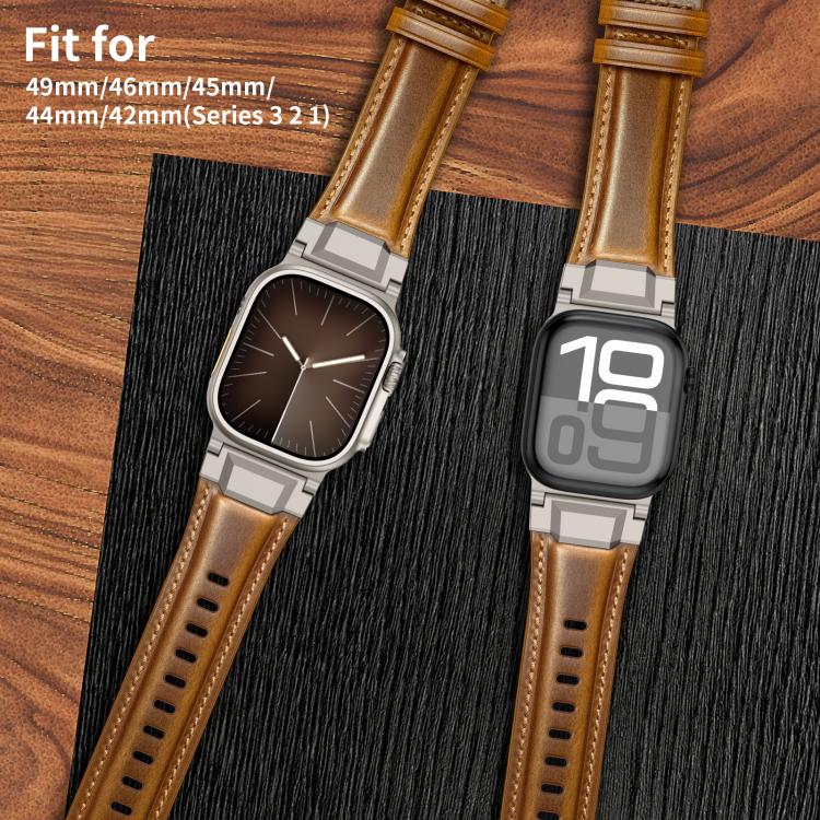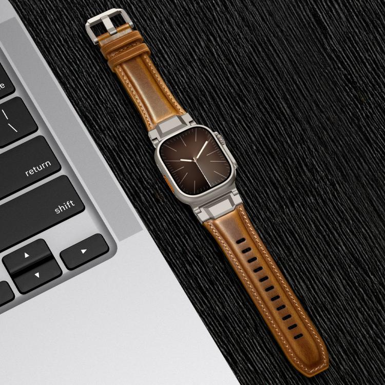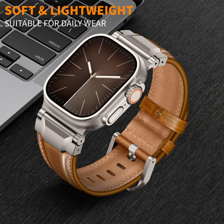 Correa de cuero estilo armadura para Apple Watch de 46 mm, 49 mm, 45 mm y 44 mm (hebilla de titanio marrón retro)