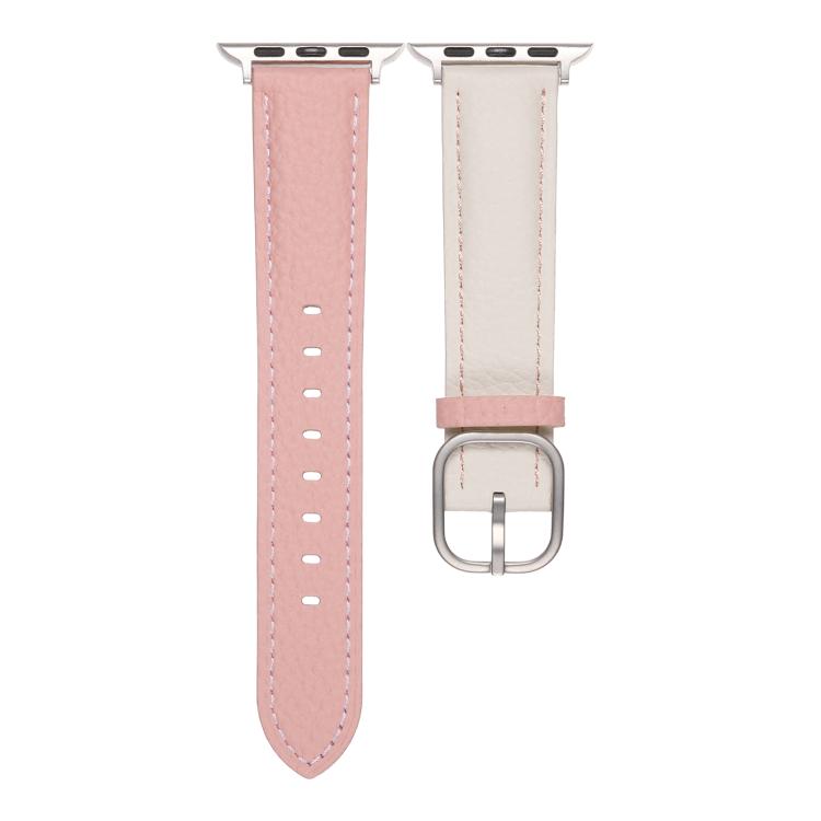 Correa de cuero genuino con textura de lichi y hebilla cuadrada para Apple Watch de 42 mm, 41 mm, 40 mm y 38 mm (blanco y rosa)