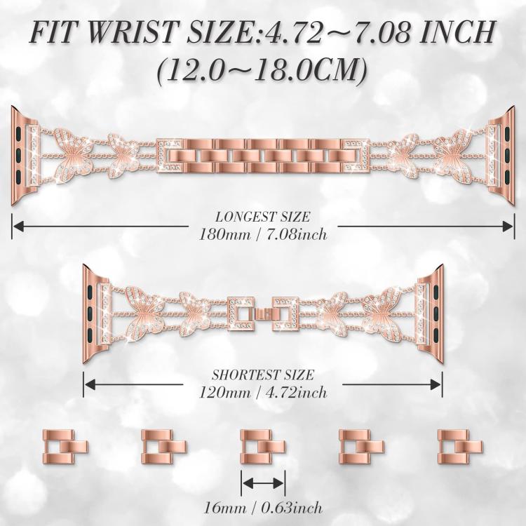 Correa de metal con diamantes en forma de mariposa para Apple Watch 38/40/41/S10 de 42 mm (oro rosa)