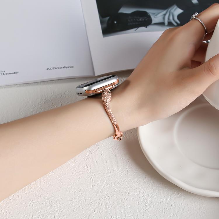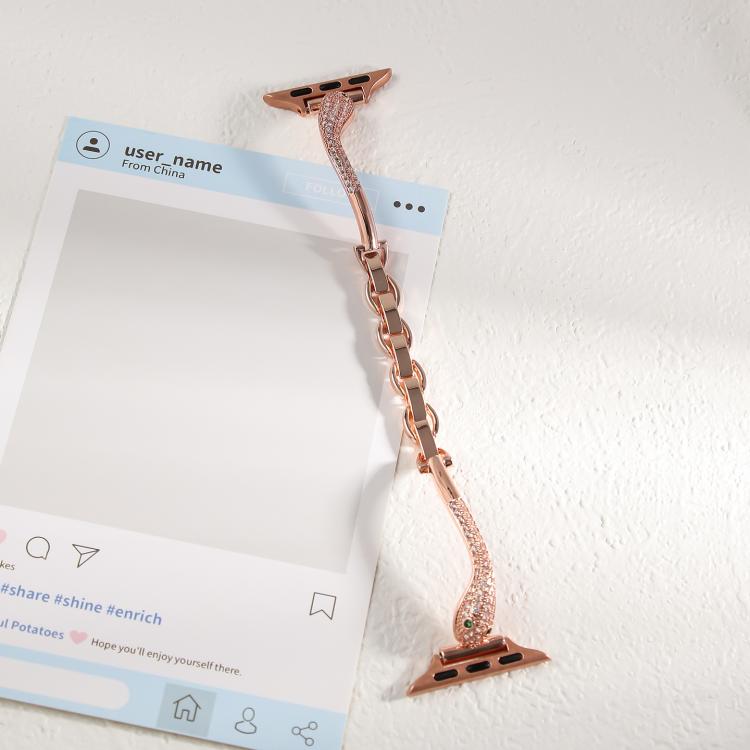 Correa de reloj con cabeza de serpiente y circonita incrustada de cobre para Apple Watch de 42 mm, 41 mm, 40 mm y 38 mm (oro rosa)