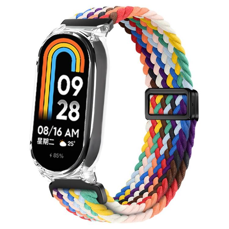 Correa de reloj elástica trenzada de nailon con hebilla magnética y marco de policarbonato transparente para Xiaomi Smart Band 9/8 (arcoíris)